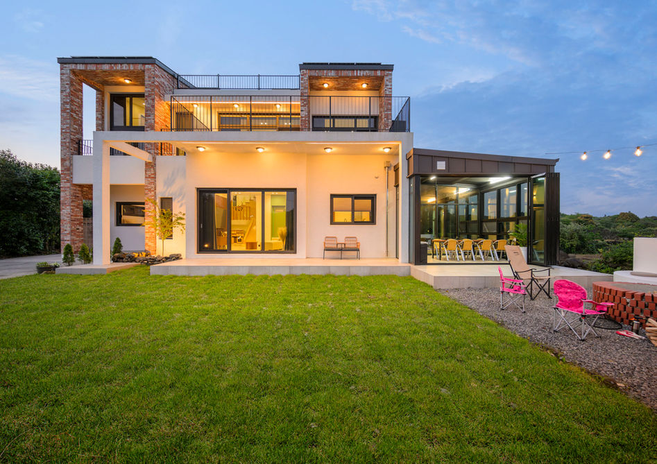 꼬맹스테이의 외부 공간은 제주의 자연과 어우러진 힐링 장소로 넓은 잔디마당과 영주산 전망, 밤하늘의 별빛을 즐길 수 있습니다.